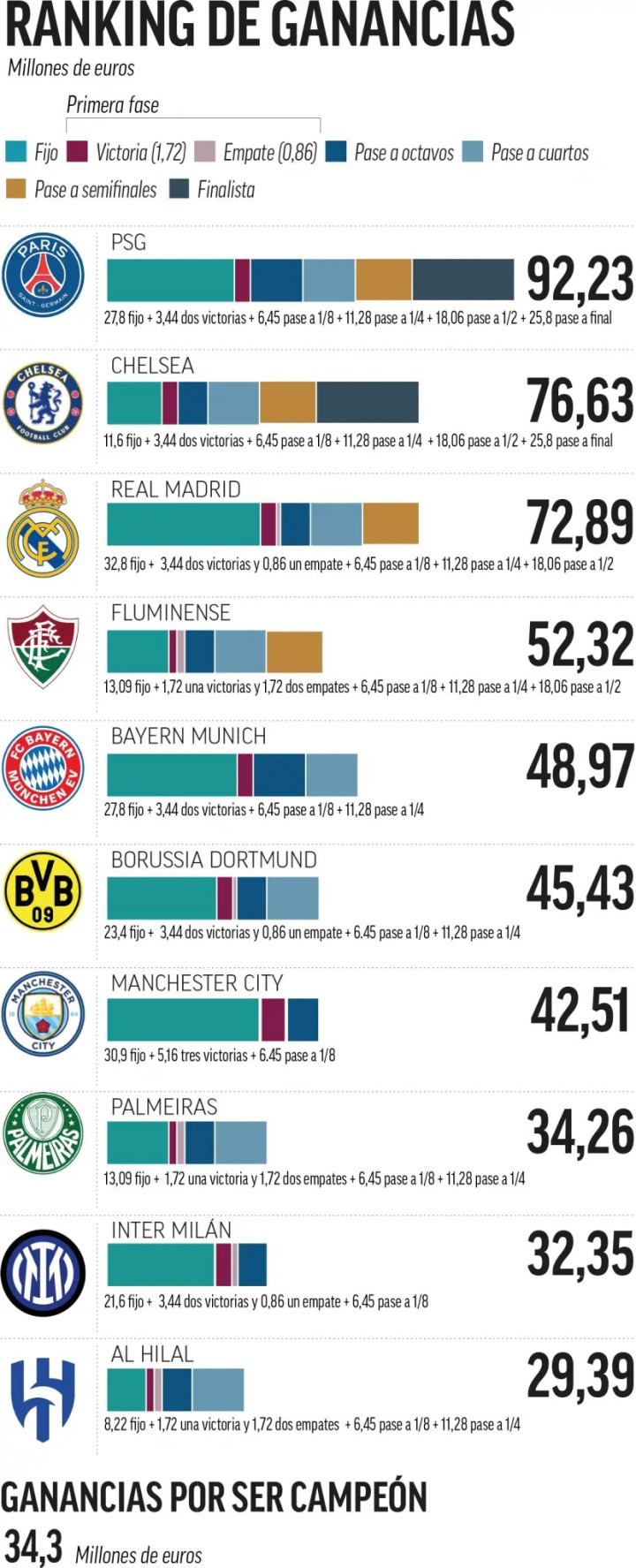 老牌豪门皇家马德里虽然止步半决赛,但也拿走了7289万欧元,排在第三位。紧随其后的是南美代表弗卢米嫩塞(5232万欧)和德甲霸主拜仁慕尼黑(4897万欧)。
